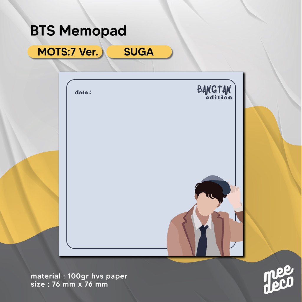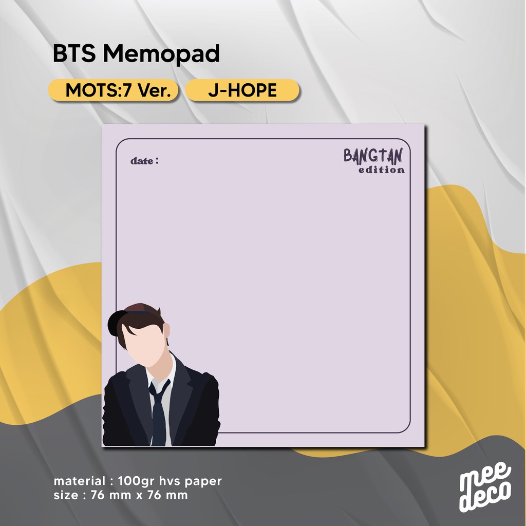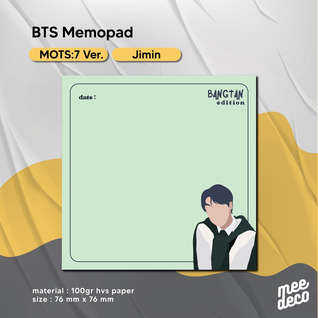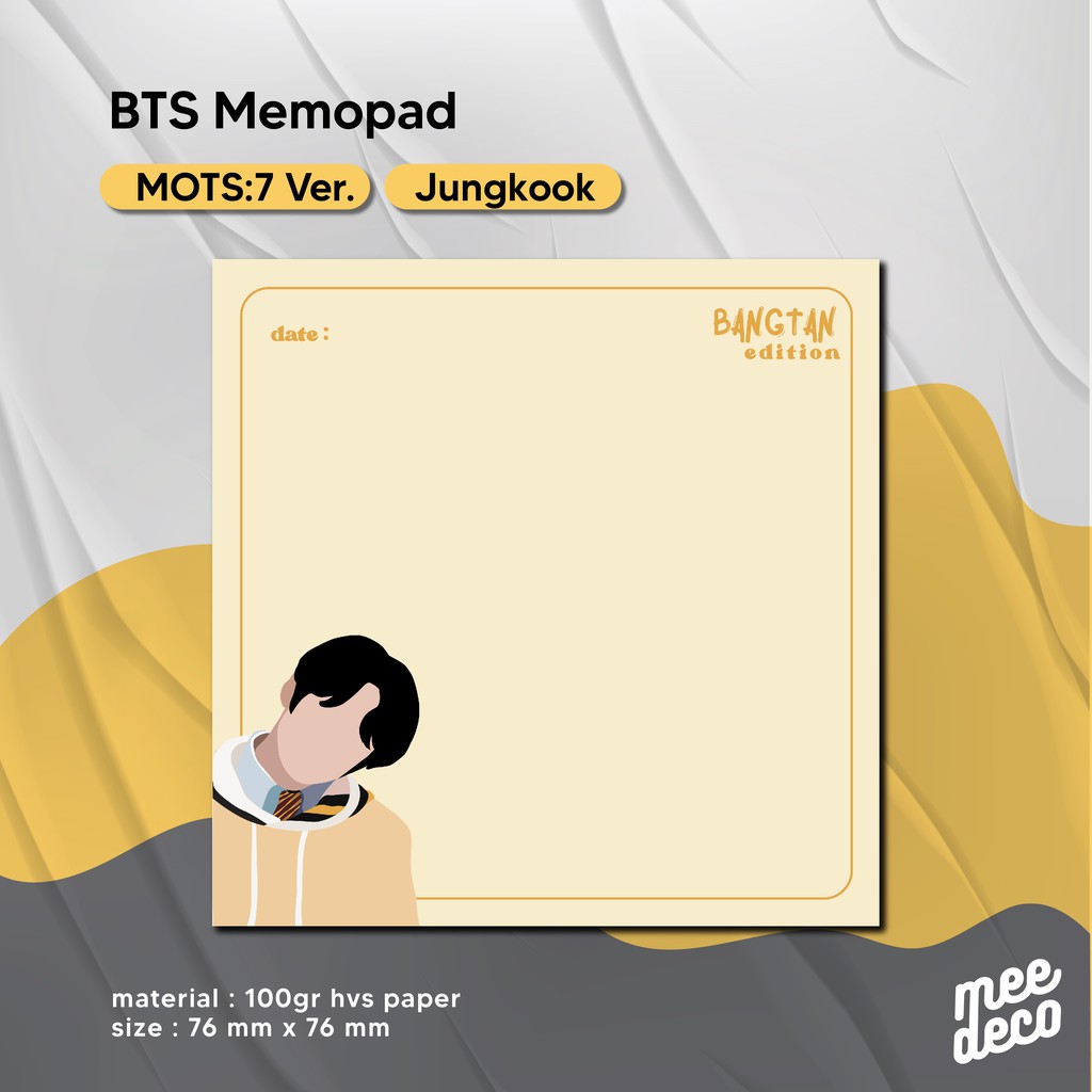 Produk BTS Memopad MOTS:7 for study harganya Rp. 7.500,00. Hingga saat ini sudah dimiliki oleh 297 orang. Mendapat Rating 4,99 dari 98. Sisa stok tersisa 186 lagi.
