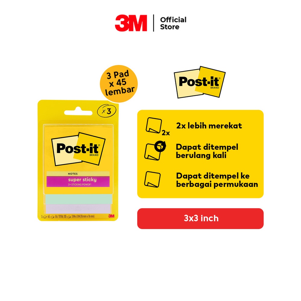 3M Post-it Super Sticky Notes 3X3" Sweets 3321-3SSJP SWT (45 Lembar x 3 Pad) Yellow / Minty Mint / Lilac / Ekonomis bisa dibeli di harga Rp. 21.500,00. Sampai saat ini sudah ada 825 kali dilihat orang. Dari jumlah tersebut 110 sudah memberi tanda love/suka.